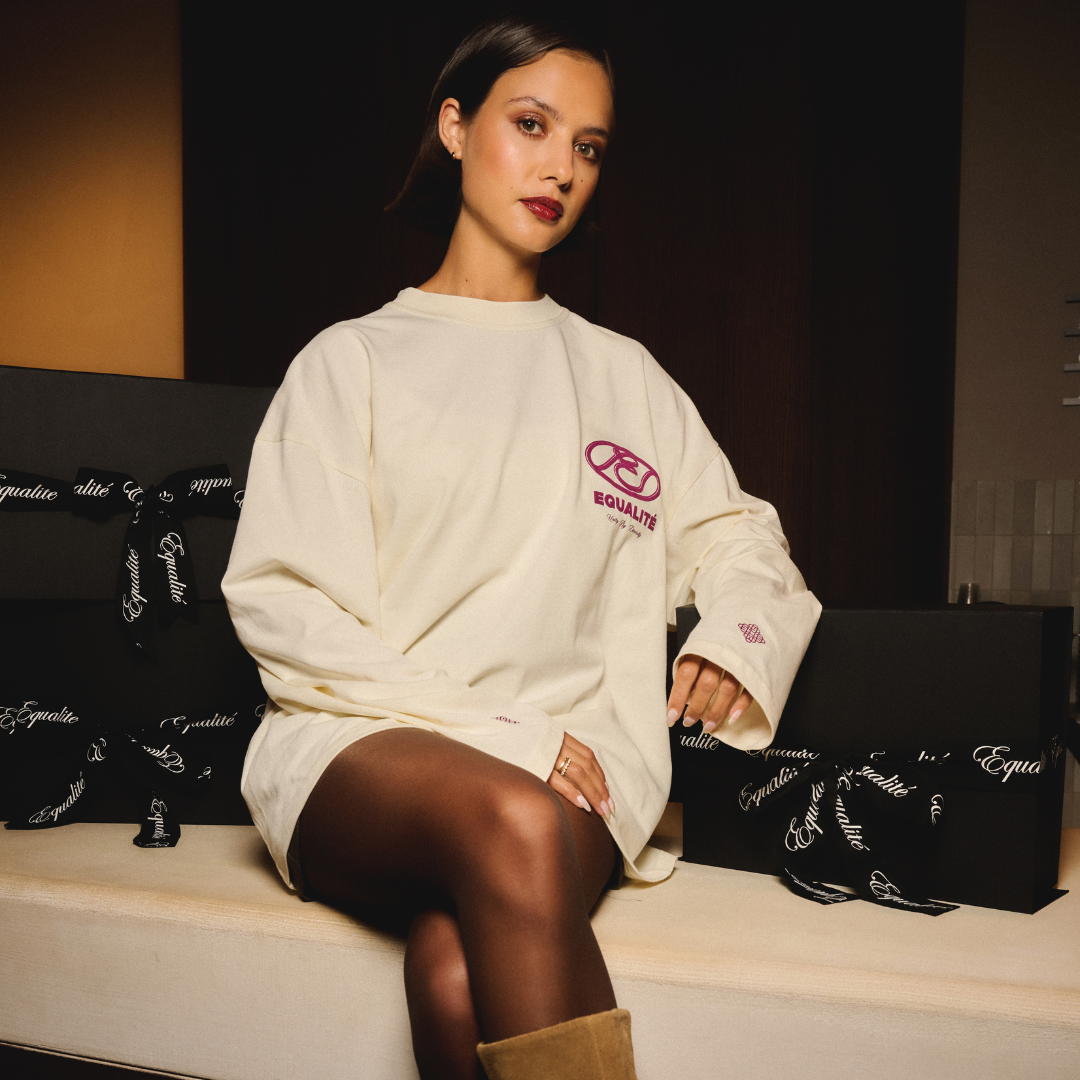 Get to know the Equalité Arid Longsleeve Tee in Off-White &Deep Purple. The long-sleeved T-shirt has an oversized fit with a round collar and features a deep purple puff print of the Arid artwork on the left chest and back.