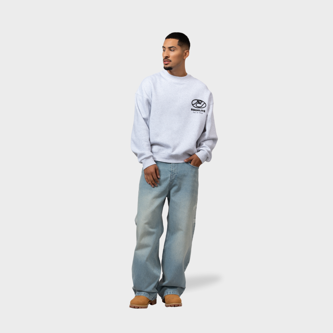 Get to know the Equalité Arid Sweater in Melange Grey. This sweater has an oversized fit and ribbed cuffs and hem. It features a black Arid logo on the left chest and back.