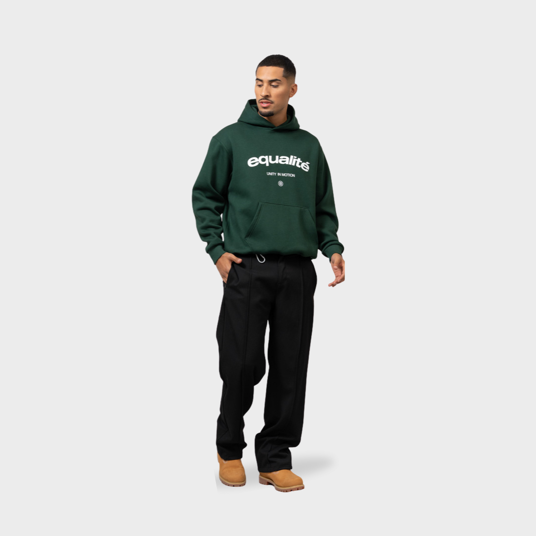 Get to know the Equalité Celeste Oversized Hoodie in Green. This hoodie has an oversized fit and features a hood, a kangaroo pocket, and ribbed cuffs and hem. A white screen-printed Celeste logo is featured centered on the chest.