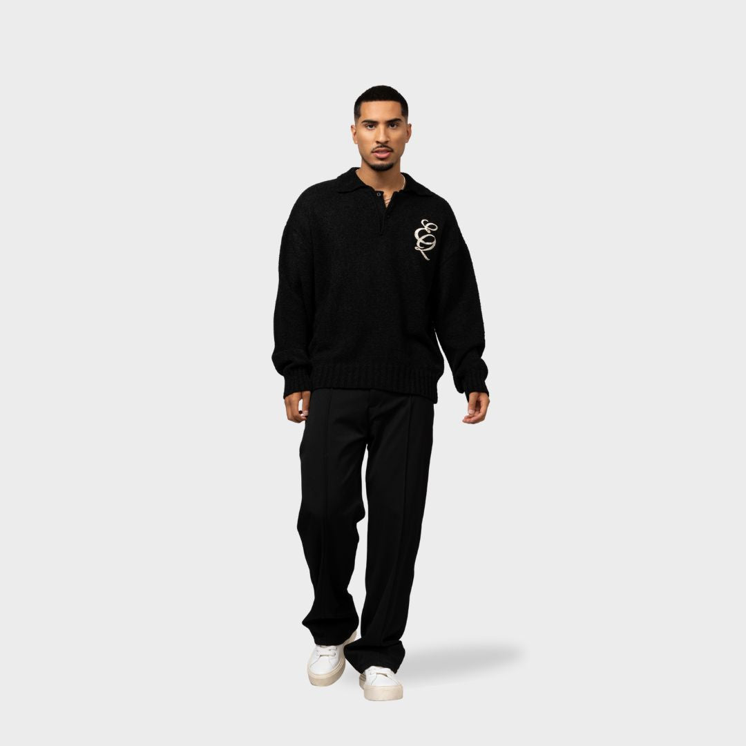 Meet the Equalité Boucle Polo in Black. This polo features an oversized fit with a button-down collar and ribbed cuffs and hem. A white embroidered EQ logo is featured on the left chest and an Equalité label on the back.