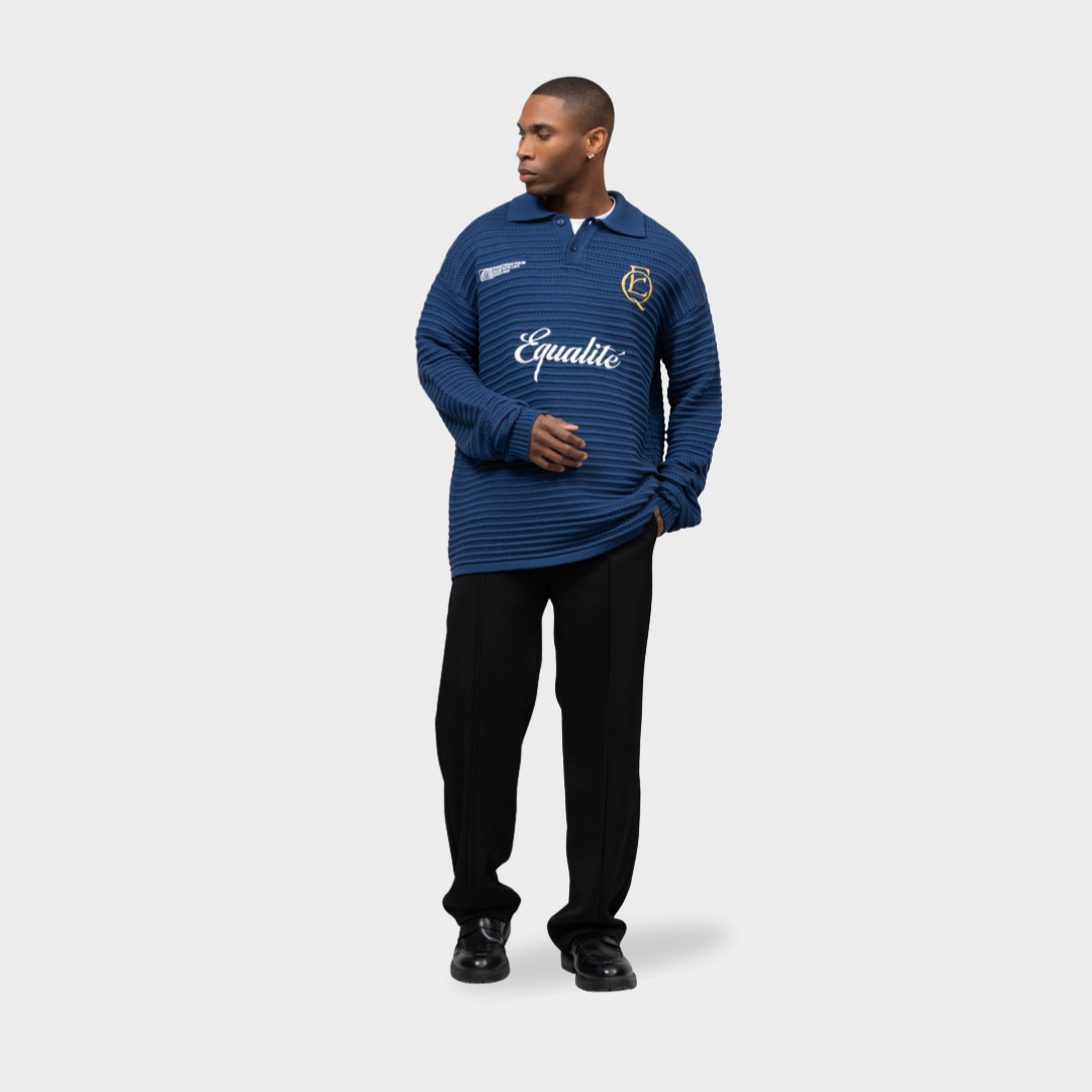 Get to know the Equalité Heritage Rib Knit Polo in Navy. This heritage rib knit polo has an oversized fit with a polo collar. The chest and back feature white embroidered artwork of the EQLT logo.