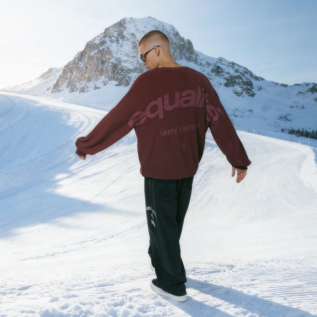 Get to know the Equalité Noor Knit Sweater in Aubergine. This sweater has an oversized fit and ribbed hem and frayed sleeve cuffs. It features an aubergine sea-print logo on the back.