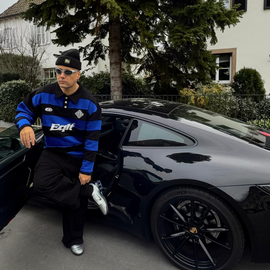 Discover the Equalité Stripe Jersey Polo in Black &Blue. The polo has an oversized fit and features a button-down collar. White embroidered artwork appears on the chest and back. The stripes on the polo have a frayed finish.