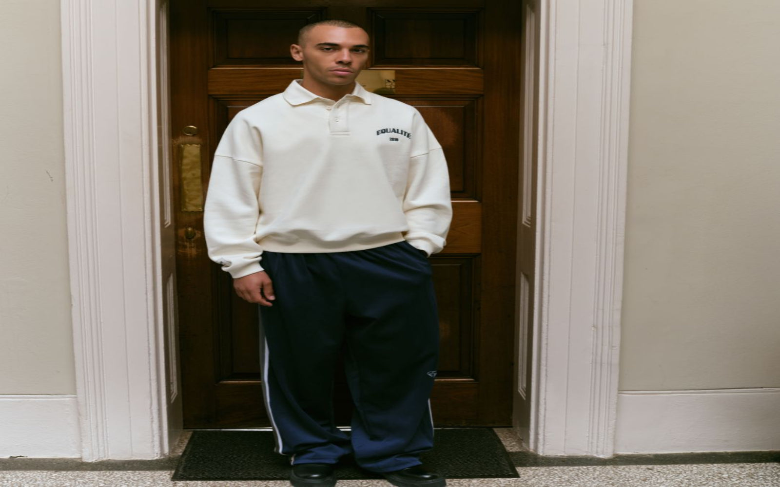 Discover the Equalité track pants in navy. These pants have an oversized fit with two zippered side pockets, a mesh lining, a mid-rise waist with a drawstring, and a single back pocket. They feature a white embroidered signature Equalité logo on the front of the left leg and the EQ logo on the back pocket.