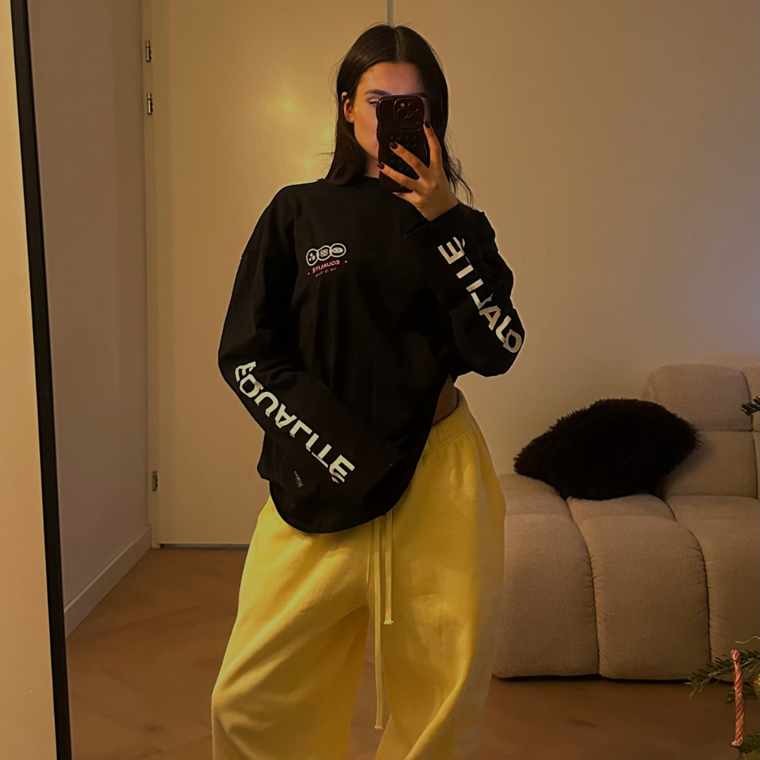 Discover the Equalité Universe Lonsleeve Tee in Black &Pink. The long-sleeved T-shirt has an oversized fit and features a round collar. White stripes are featured on the left chest, back, and sleeves. & pink silkscreen artworks.