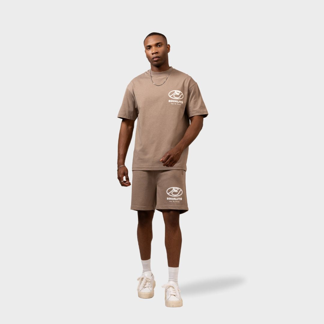 Wir präsentieren die Equalité Arid Oversized Shorts in Taupe. Die Shorts haben einen Oversize-Schnitt mit zwei Reißverschlusstaschen, einem mittelhohen Bund mit Kordelzug und zwei Gesäßtaschen. Die Shorts zeigen einen weißen Puff-Print des Arid-Artworks auf der Vorderseite des linken Beins. Die Shorts sind Teil eines Sets und können mit zwei passenden T-Shirts kombiniert werden.