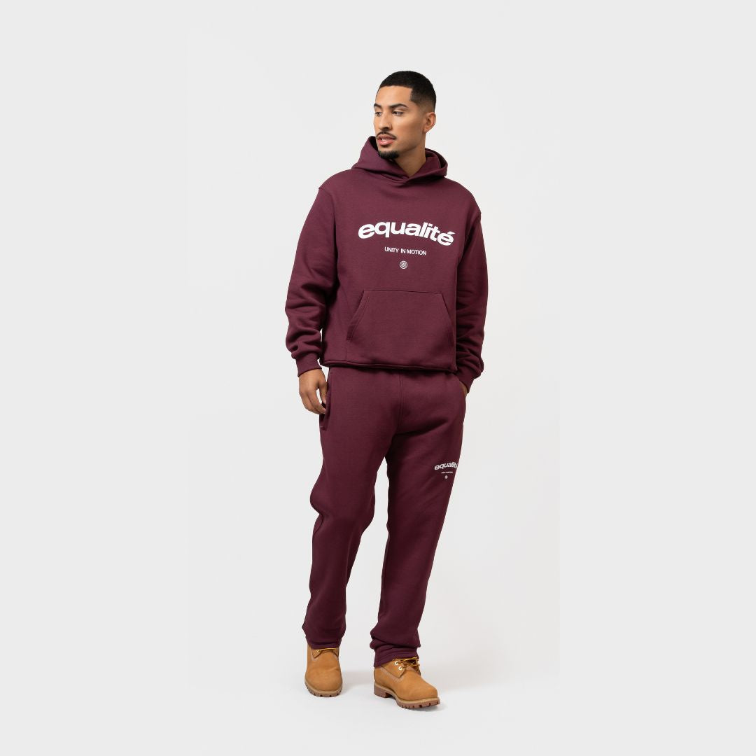 Meet de Equalité Celeste Jogger Set in Aubergine .De Equalité Celeste Oversized Hoodie heeft een oversized fit en is voorzien van een capuchon, een kangoeroezak en geribbelde boorden bij de mouwen en onderkant. Midden op de borst zit een witte zeefdruk van het Celeste logo op de borst. De jogger pants heeft een oversized fit met twee steekzakken voorzien van een rits en een mid-rise taille met trekkoord. De jogger pants is voorzien van een witte zeefdruk van het Celeste logo op het linkerbeen.