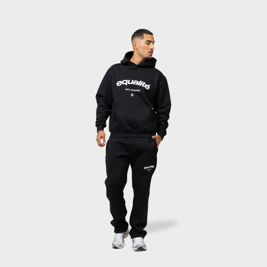Meet de Equalité Celeste Jogger Set in Black. De Equalité Celeste Oversized Hoodie heeft een oversized fit en is voorzien van een capuchon, een kangoeroezak en geribbelde boorden bij de mouwen en onderkant. Midden op de borst zit een witte zeefdruk van het Celeste logo op de borst. De jogger pants heeft een oversized fit met twee steekzakken voorzien van een rits en een mid-rise taille met trekkoord. De jogger pants is voorzien van een witte zeefdruk van het Celeste logo op het linkerbeen.
