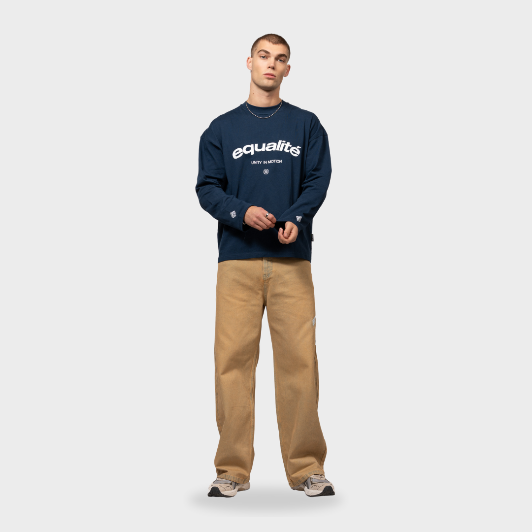 Entdecke das Equalité Celeste Langarmshirt in Marineblau. Dieses Langarmshirt hat eine Oversized-Passform und einen Rundhalsausschnitt. Ein weißer Siebdruck des Celeste-Motivs ziert Brust und Rücken.