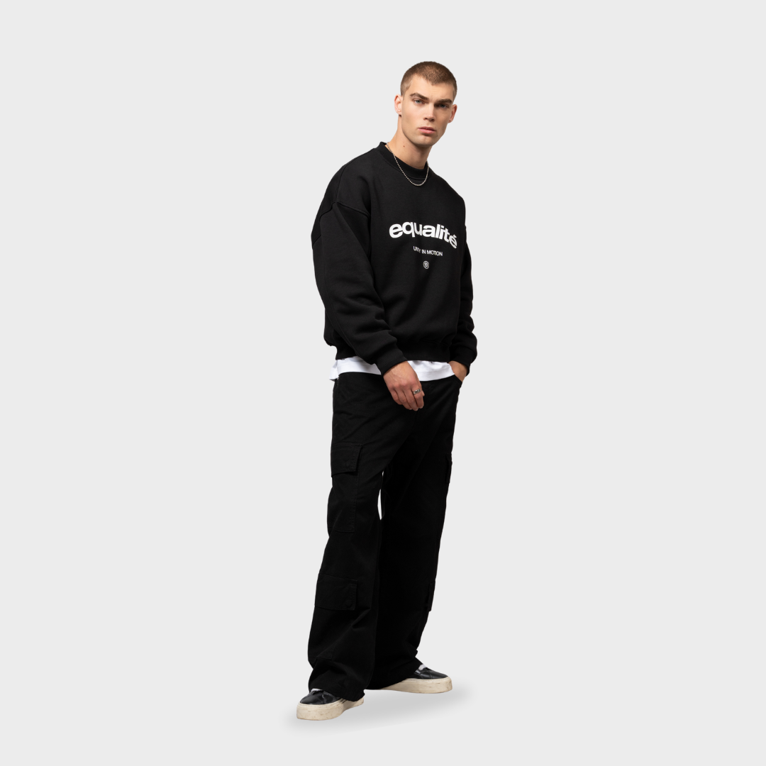Probieren Sie den Equalité Celeste Oversized Sweater in Schwarz. Dieser Pullover hat eine Oversized-Passform und gerippte Bündchen an Ärmeln und Saum. Er ist mit einem weißen, aufgedruckten Celeste-Logo auf der Brust versehen.