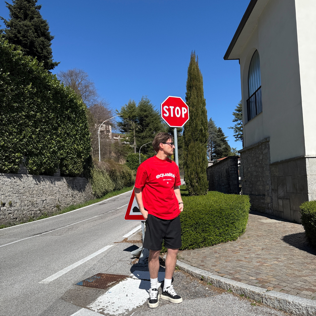 Entdecken Sie das Equalité Celeste Oversized Tee in Rot. Das T-Shirt hat eine übergroße Passform mit rundem Kragen und ist mit einem Siebdruck des Celeste-Logos auf der linken Brust und auf dem Rücken versehen.
