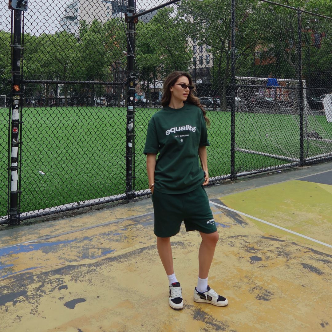 Lernen Sie die Equalité Celeste Shorts in Grün kennen. Die Shorts haben eine übergroße Passform mit zwei Seitentaschen mit Reißverschluss, einer mittelhohen Taille mit Kordelzug und zwei Gesäßtaschen. Die Shorts verfügen über einen weißen Siebdruck des charakteristischen Celeste-Logos auf der Vorderseite des linken Beins. Die Shorts sind Teil eines Sets und können mit zwei passenden T-Shirts kombiniert werden.