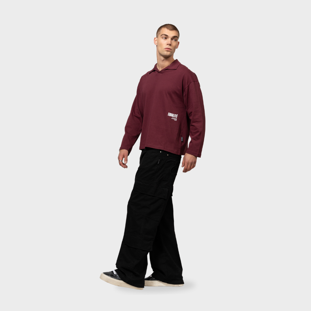 Entdecken Sie das Equalité Elia Langarmshirt in Burgunderrot & Weiß. Das langärmelige T-Shirt hat eine Oversize-Passform und einen Polokragen. Ein weißer Siebdruck mit einem Kunstwerk von Elia befindet sich an der Seite und auf der Rückseite.