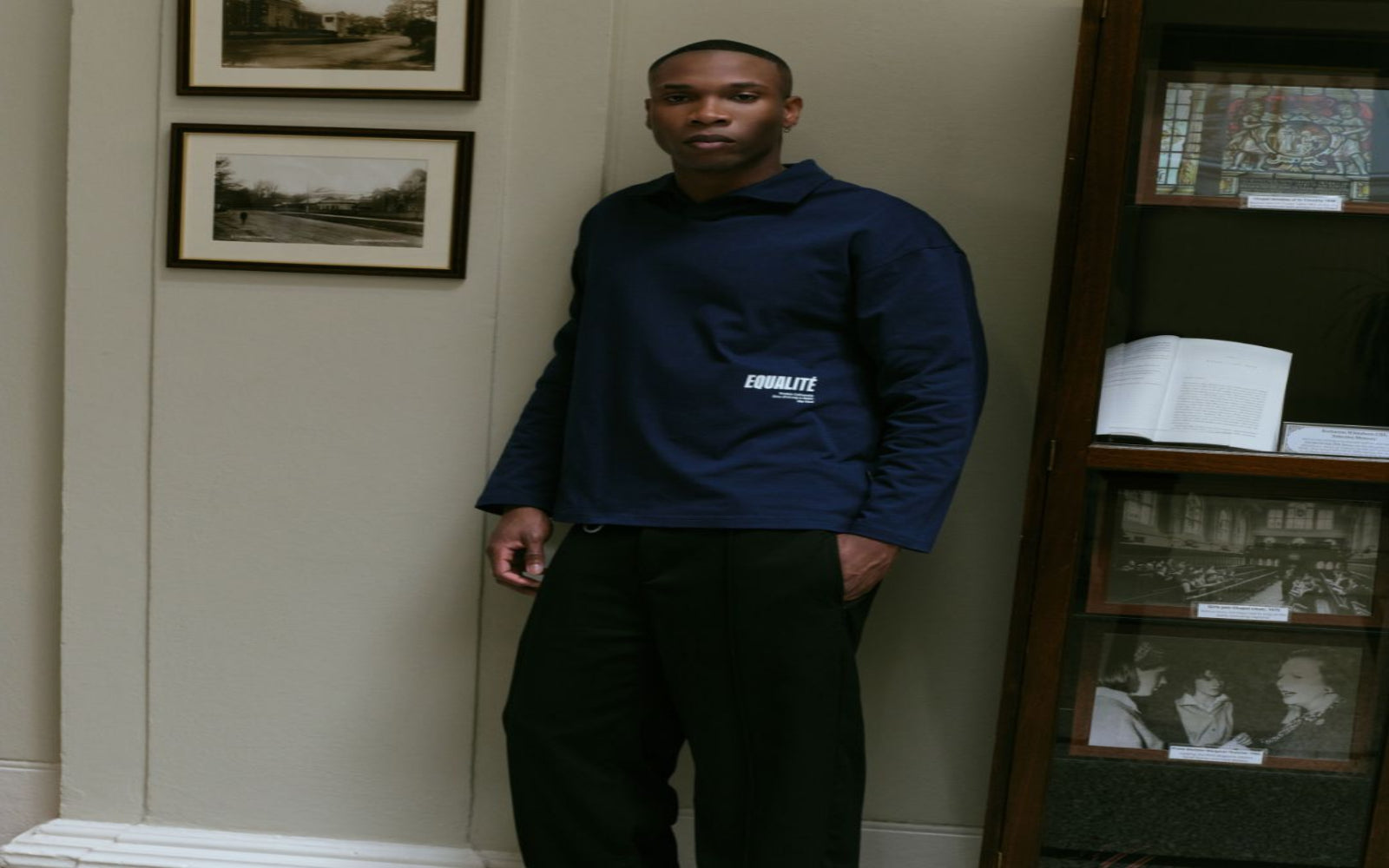 Entdecken Sie das Equalité Elia Langarm-T-Shirt in Marineblau. Dieses Langarm-T-Shirt hat eine übergroße Passform und einen Polokragen. Das Elia-Artwork ist seitlich und hinten in Weiß aufgedruckt.
