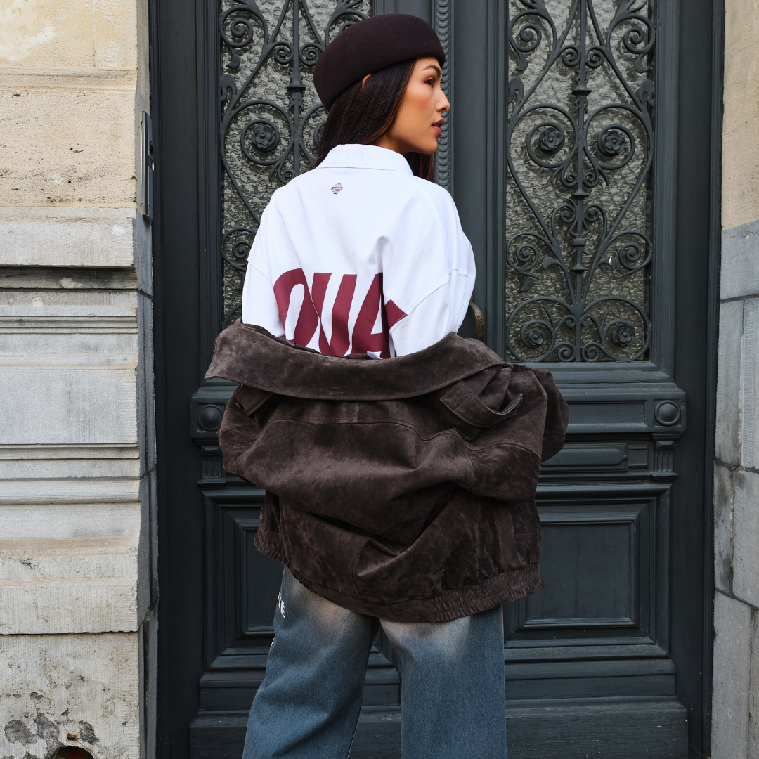 Entdecken Sie das Equalité Elia Langarmshirt in Weiß & Burgunderrot. Dieses langärmelige T-Shirt hat eine Oversize-Passform und einen Polokragen. An der Seite und am Rücken befindet sich ein burgunderroter Siebdruck mit einem Kunstwerk von Elia.