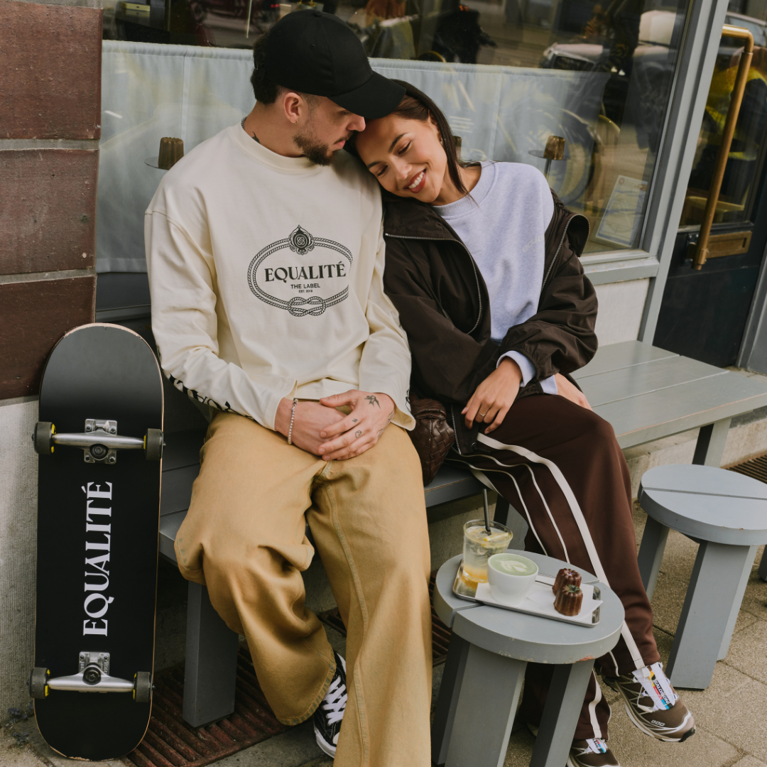 - Aufgedrucktes Equalité-Logo an der Seite des Hosenbeins