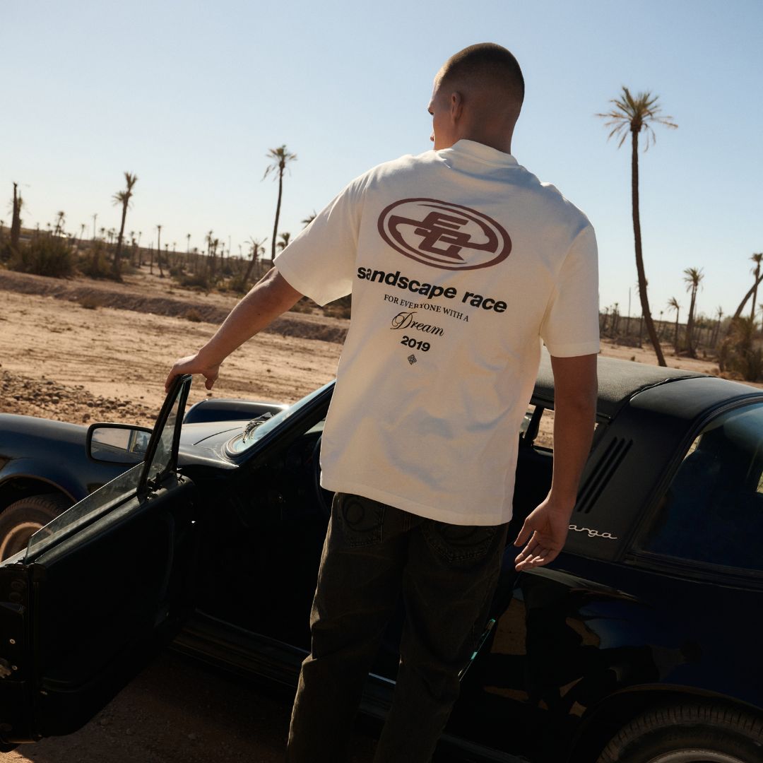 Messen Sie das übergroße T-Shirt „Equalité Grit“ in Off-White. Das T-Shirt hat eine übergroße Passform und einen runden Kragen. Auf der linken Brust und auf dem Rücken befindet sich ein rosa Puff-Print-Artwork.