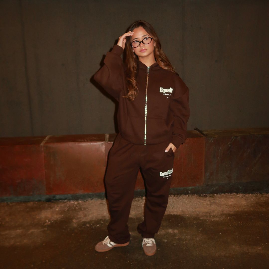 Lernen Sie die Jogginghose Equalité Mirage in Braun kennen. Die Joggerhose hat eine übergroße Passform mit zwei Seitentaschen mit Reißverschluss und einer mittelhohen Taille mit Kordelzug. Die Jogginghose hat auf der Vorderseite des linken Beins einen weißen Puffdruck des Sandscape-Logos. Die Hose ist Teil eines Sets und kann mit einem passenden Zip-Hoodie kombiniert werden.