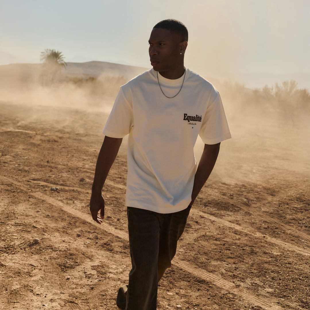 Entdecken Sie das übergroße T-Shirt „Equalité Mirage“ in Off-White. Das T-Shirt hat eine übergroße Passform und einen runden Kragen. Auf der linken Brust und auf dem Rücken befindet sich ein brauner Puffdruck des Sandscape-Logos.