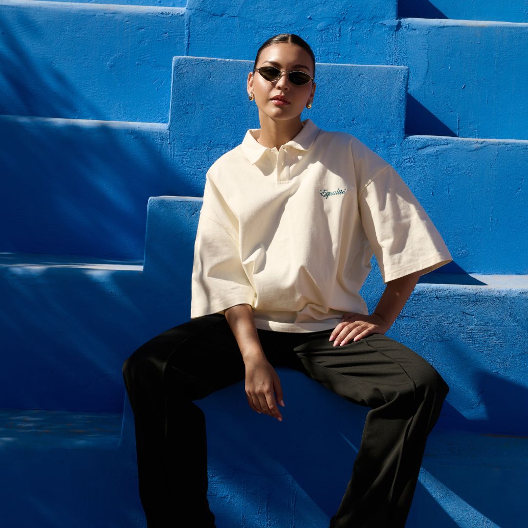 Messen Sie das kastenförmige Poloshirt Equalité Oasis in Off-White. Das Polo hat eine kastige Passform und einen Polokragen. Auf der linken Brust befindet sich ein petrolgrünes, gesticktes Equalité-Logo und auf der Rückseite ein gesticktes Kunstwerk.