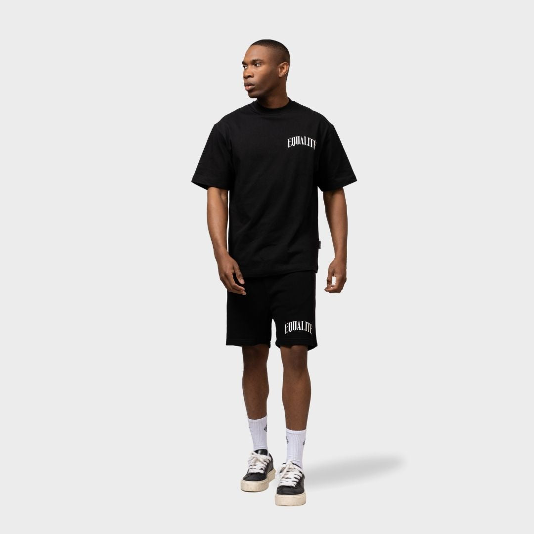 Entdecken Sie die Equalité Oliver Shorts in Schwarz. Die Shorts haben eine übergroße Passform mit zwei Seitentaschen mit Reißverschluss, einer mittelhohen Taille mit Kordelzug und zwei Gesäßtaschen. Die Shorts verfügen über einen weißen Siebdruck des charakteristischen Oliver-Logos auf der Vorderseite des linken Beins. Die Shorts sind Teil eines Sets und können mit zwei passenden T-Shirts kombiniert werden.
