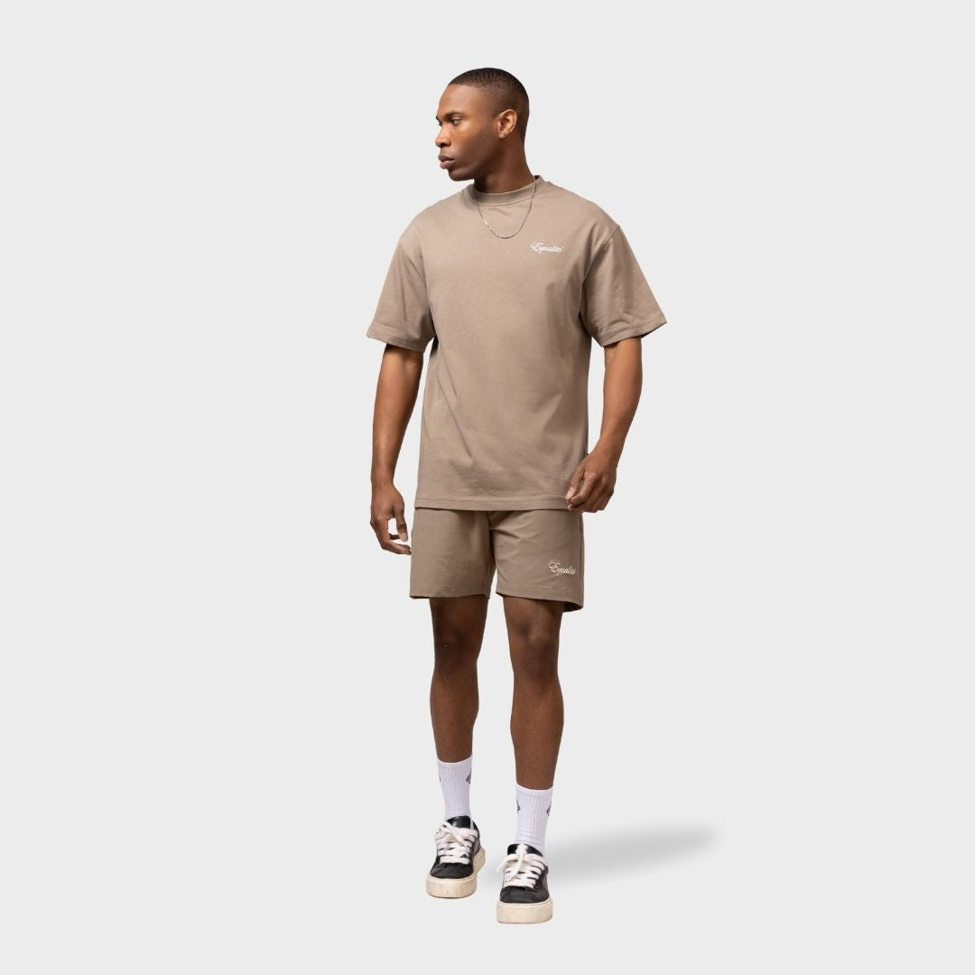 Entdecken Sie die Equalité Signature Shorts in Taupe. Die Shorts haben eine übergroße Passform mit zwei Seitentaschen mit Reißverschluss, einer mittelhohen Taille mit Kordelzug und zwei Gesäßtaschen. Die kurze Hose verfügt über ein weiß gesticktes Equalité-Logo auf der Vorderseite des linken Beins. Die Shorts sind Teil eines Sets und können mit einem passenden T-Shirt kombiniert werden.