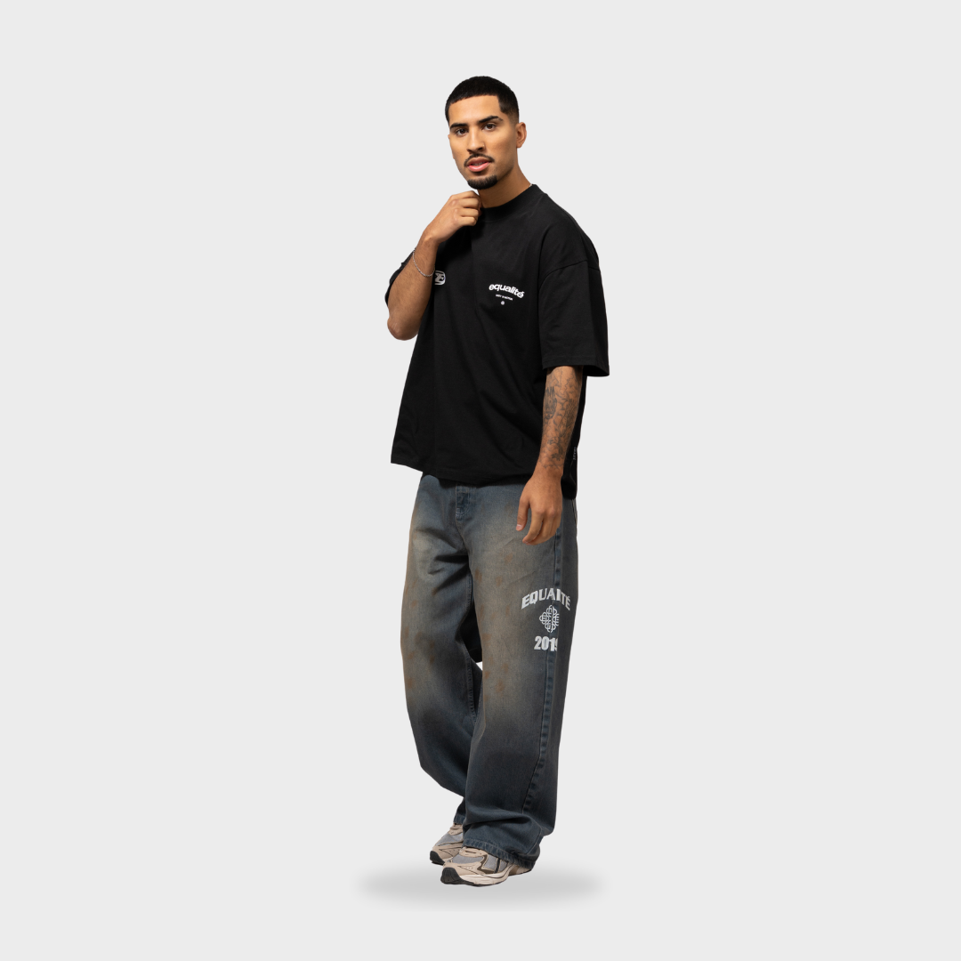 Wir präsentieren das Equalité Stay Equal Boxy Tee in Schwarz. Das T-Shirt hat eine kastenförmige Passform, einen Rundhalsausschnitt und einen weißen Siebdruck des Stay Equal-Logos auf Brust und Rücken.