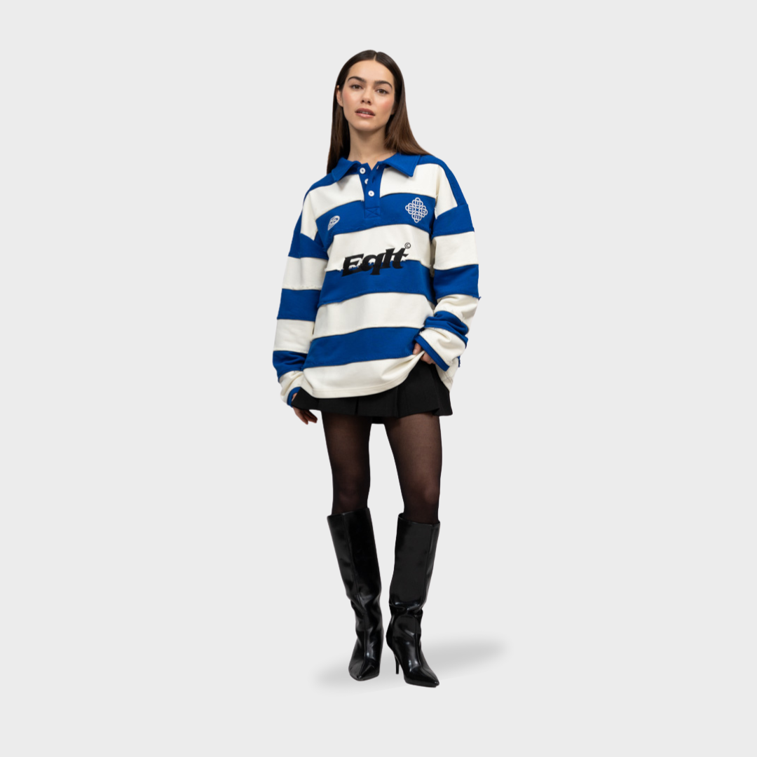 Entdecken Sie das Equalité Stripe Jersey Polo in Off-White &Blau. Das Poloshirt hat eine Oversize-Passform und einen Button-Down-Kragen. Brust und Rücken sind mit Stickereien verziert. Die Streifen haben einen ausgefransten Abschluss.