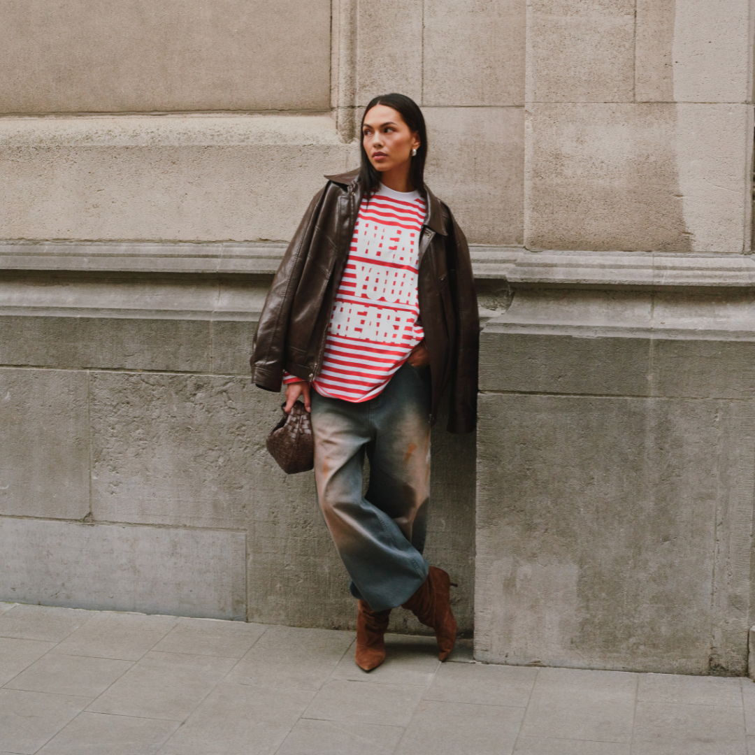 Entdecken Sie das gestreifte Langarmshirt von Equalité in Rot & Weiß. Das langärmlige T-Shirt hat eine Oversize-Passform und einen Rundhalsausschnitt. Auf Brust und Rücken befindet sich ein weißer Siebdruck des „Stay Equal“-Motivs.