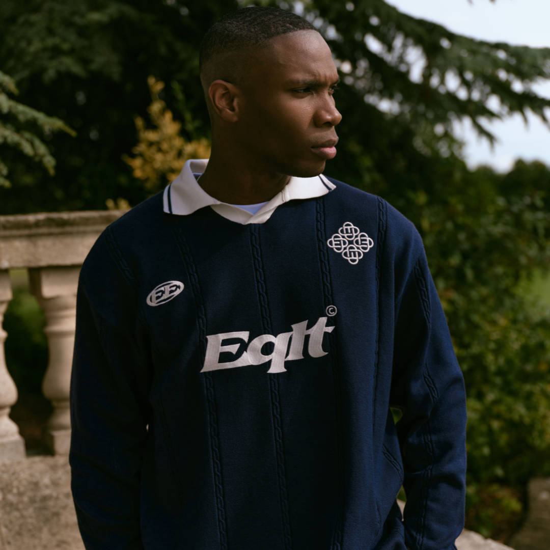 Lernen Sie das marineblaue Equalité Strick-Poloshirt mit langen Ärmeln kennen. Dieses langärmlige Poloshirt aus Strickjersey hat eine Oversized-Passform und einen Polokragen. Brust und Rücken sind mit einer weißen Stickerei des EQLT-Logos verziert.