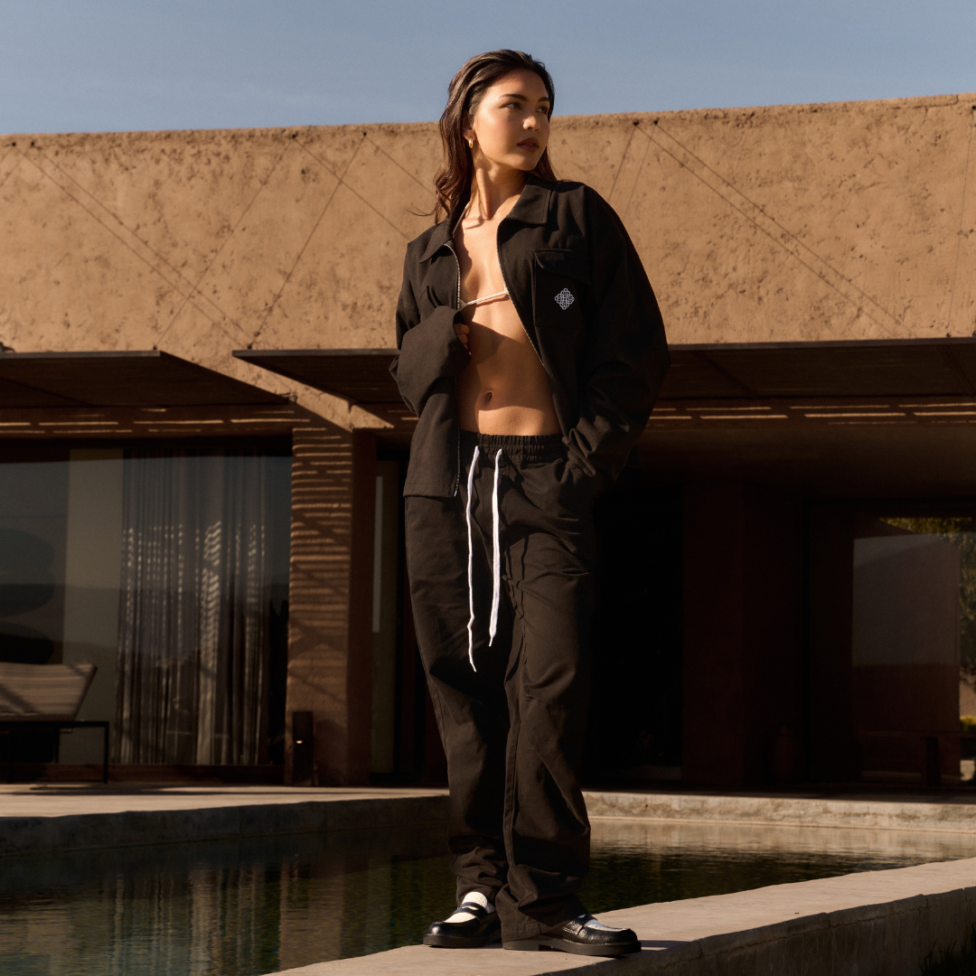 Die Jacke hat eine boxy Passform und ist mit einem Reißverschluss, einem spitzen Kragen und Brusttaschen ausgestattet. Auf der linken Brust befindet sich ein gesticktes Societé-Symbol. Diese Symbol Boxy Jacket ist Teil eines Sets und lässt sich perfekt mit der passenden Hose kombinieren.