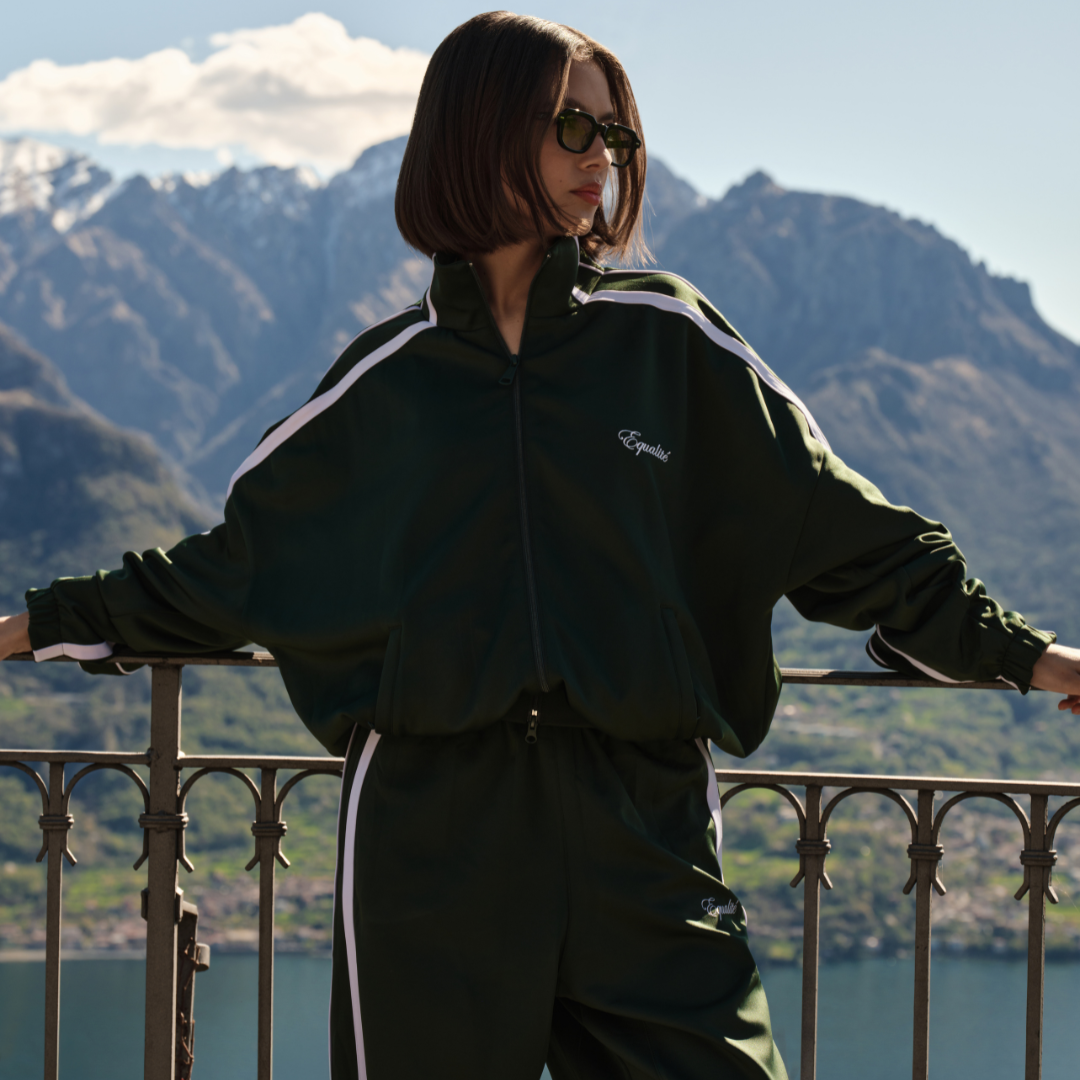 Entdecken Sie die Equalité track jacket in Grün. Die Jacke hat eine übergroße Passform und verfügt über ein Netzfutter, einen Reißverschluss, zwei Reißverschlusstaschen sowie gerippte Bündchen und Saum. Auf der linken Brust und auf dem Rücken befindet sich ein weiß gesticktes Equalité-Logo.