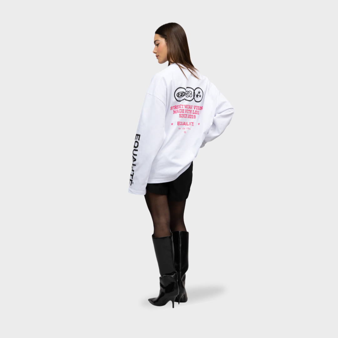 Entdecke das weiße Equalité Universe Langarmshirt. Dieses Langarmshirt hat eine Oversized-Passform und einen Rundhalsausschnitt. Schwarze Streifen zieren die linke Brust, den Rücken und die Ärmel. &und rosafarbene Siebdruckkunstwerke.